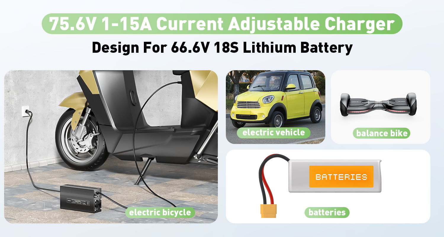 NOEIFEVO 75.6V 1A-15A Current Adjustable Battery Charger for 66.6V 18S Lithium Li-ion Lipo Battery, Ebike Scooter Electric Motorcycle Charger